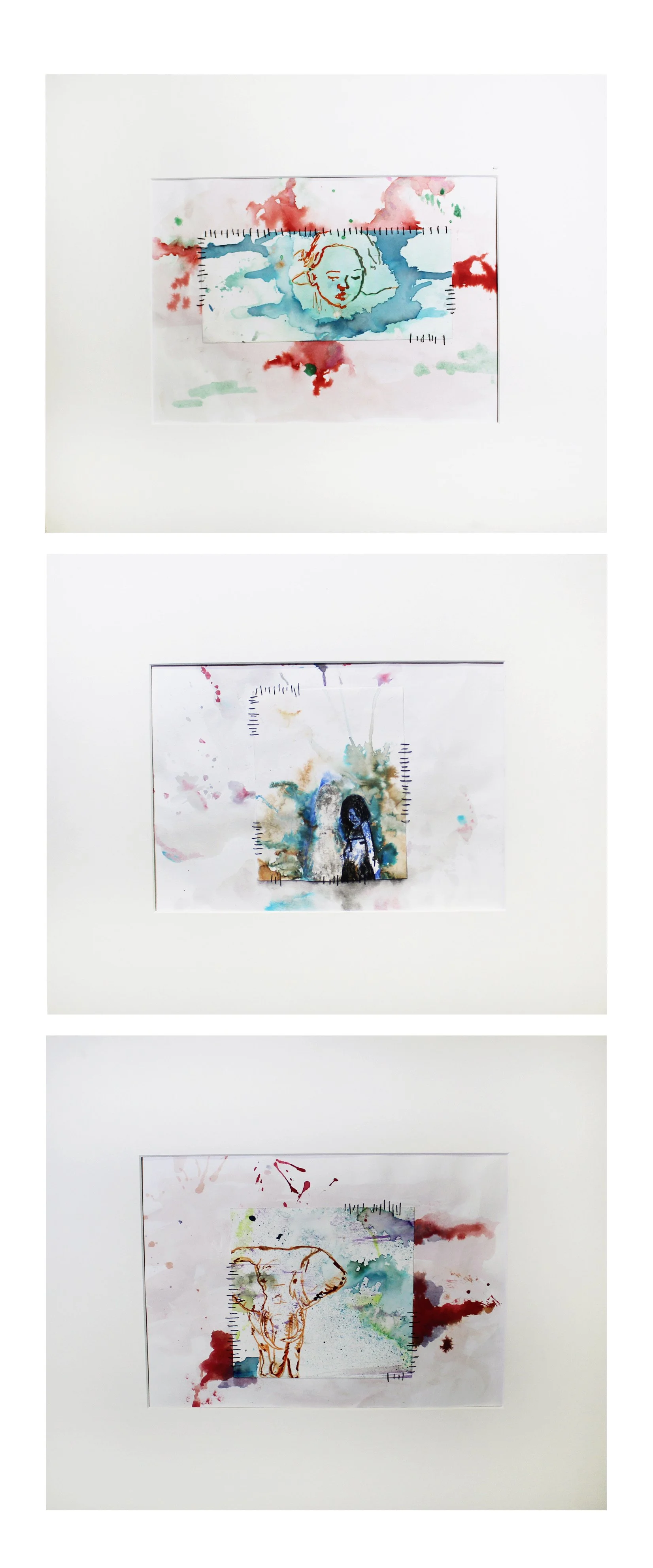 Water colour and ink on cartridge, with stitching and print transfers.