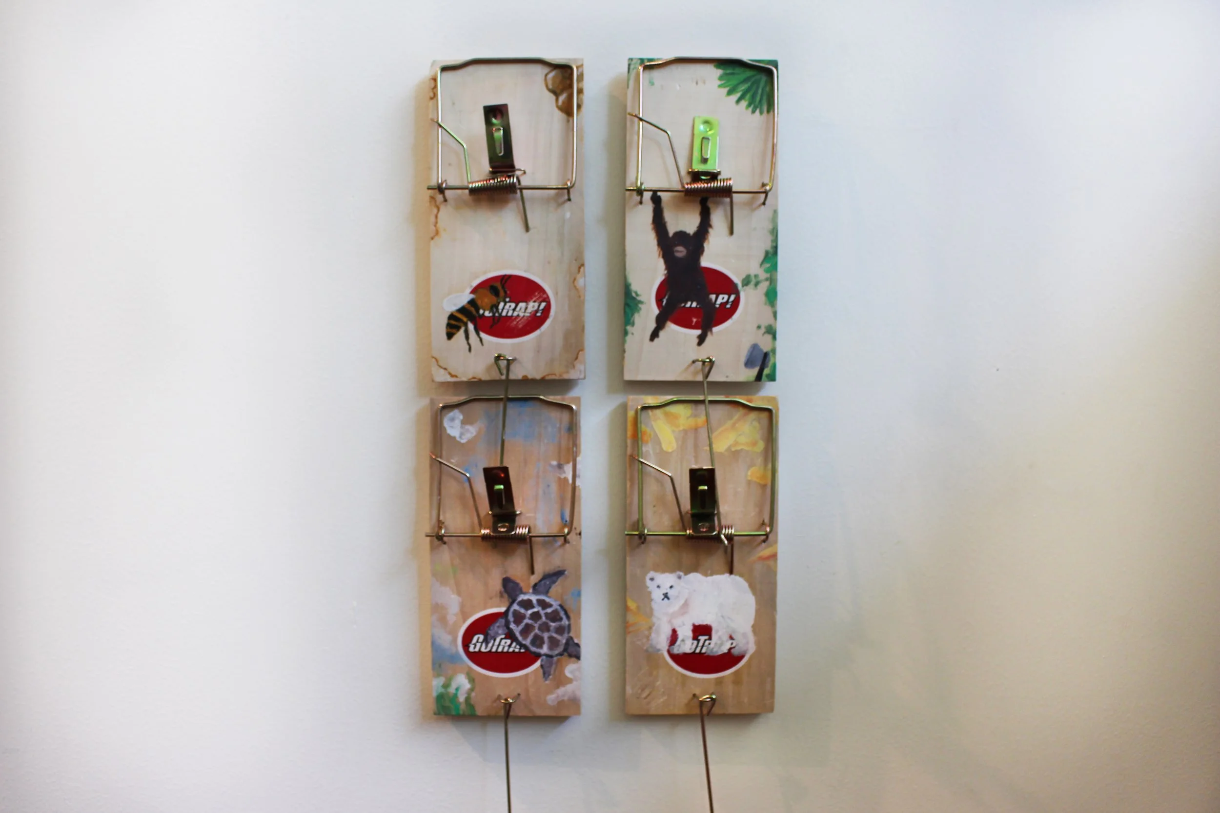 An artwork depicting four species facing extinction due to human activities, highlighting our impact on the planet’s biodiversity. Painted on rat traps, tools commonly used to kill rats, the piece confronts viewers with the stark reality that human actions threaten other species’ survival, drawing a parallel to the painful and destructive nature of rat traps.